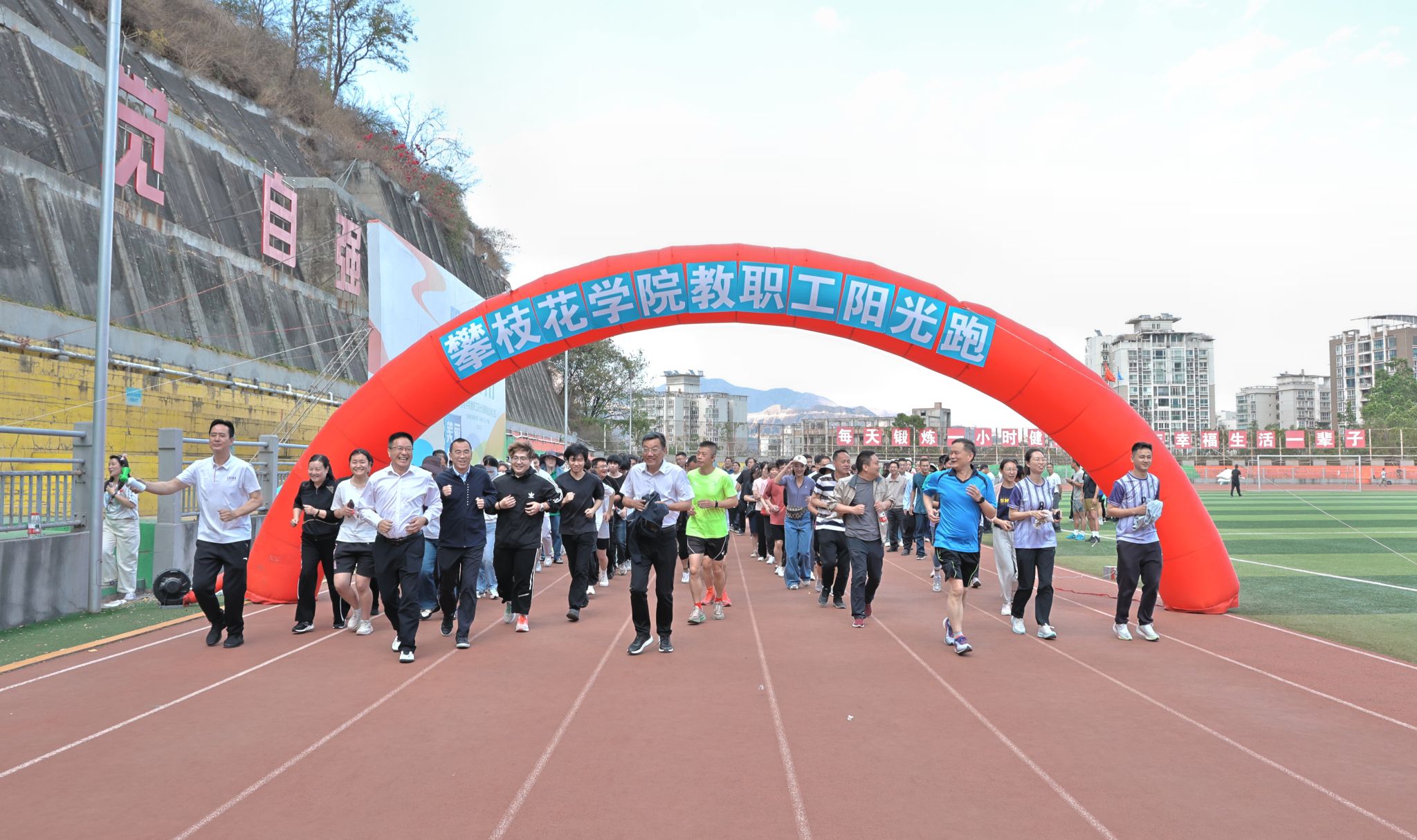 为深入贯彻《健康中国2030规划纲要》精神,响应学校“阳光健康美丽”应用型一流大学建设要求,切实关爱全校教职工身心健康,营造全民健身的校园氛围。2026年3月25日下午,攀枝花学院2026年教职工阳光健康跑启动仪式在学校运动场隆重举行。学校党委副书记、校长李兴贵,党委副书记、工会主席刘立新,校工会、体育部相关负责人及300余名教职工共同参与本次仪式,副校长张旭辉主持仪式。